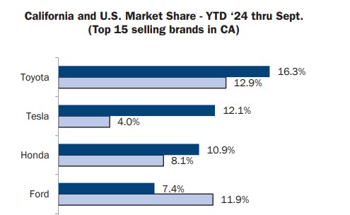 With the Model Y leading in individual model sales, and the Model 3 also giving a strong showing, Tesla is positioned as California’s second-best-selling brand, with a market share of 12.1%. This is down 12.6% from last year and down 3.5% since the third quarter of 2023. Toyota holds the top spot with 16.3% of the market. Behind Tesla are Honda (10.9%) and Ford (7.4%).
