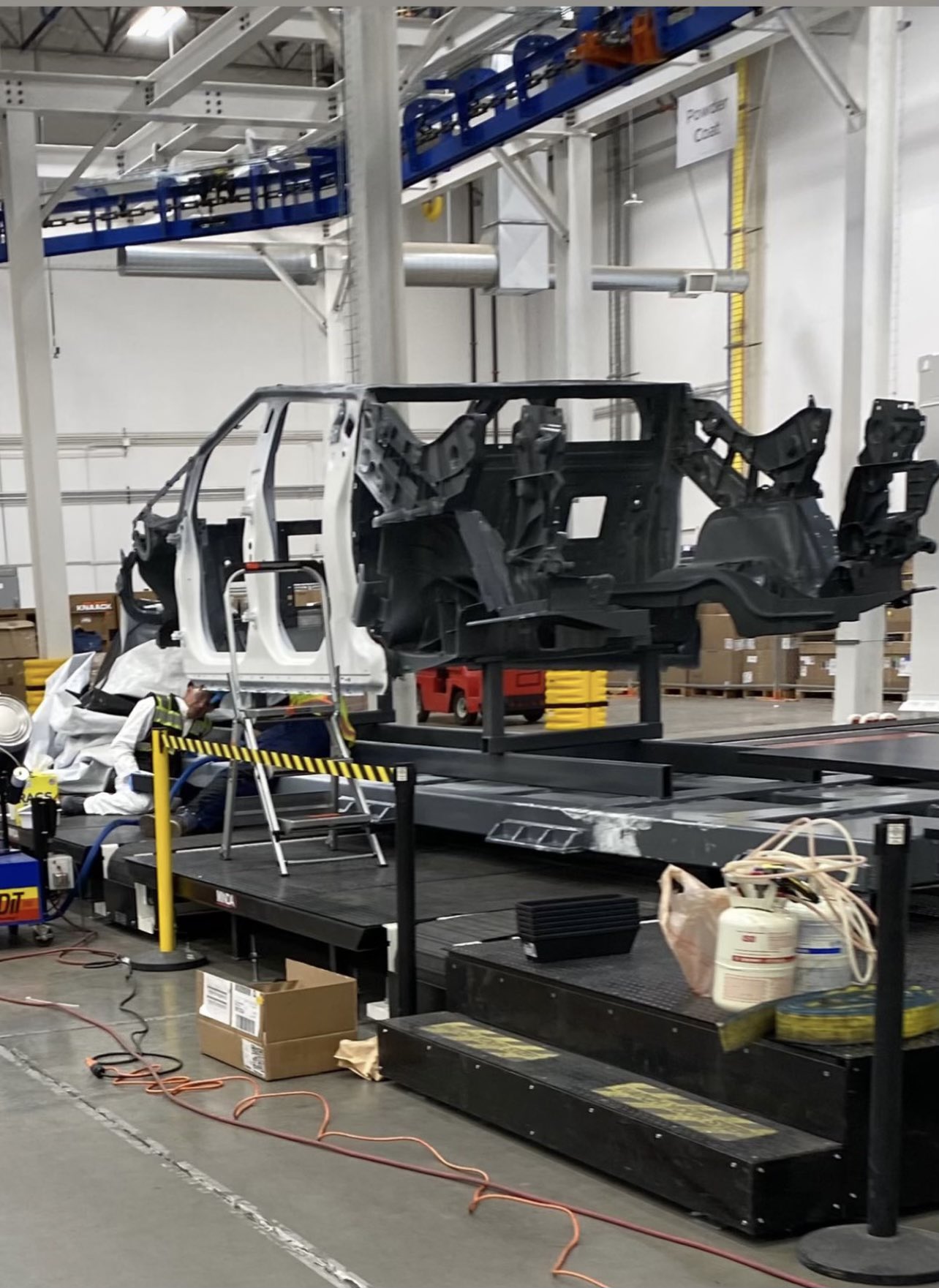 One thing that was notable about the photo is that above the Cybertruck there is a sign that says “Powder Coat,” and based on the white left side of the Cybertruck frame it does appear to be partially coated, with some overspray.