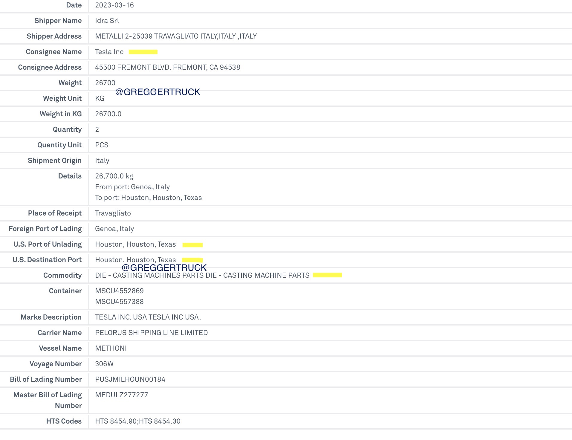 According to import records uncovered by Cybertruck enthusiast @greggertruck, more components from IDRA arrived in Texas this month. According to the bill of lading, a document issued by a carrier to acknowledge receipt of cargo for shipment, the parts originated from Genoa, Italy and were destined for the Port of Houston, where they arrived last week on March 16, 2023. (via CybertruckOwnersClub)