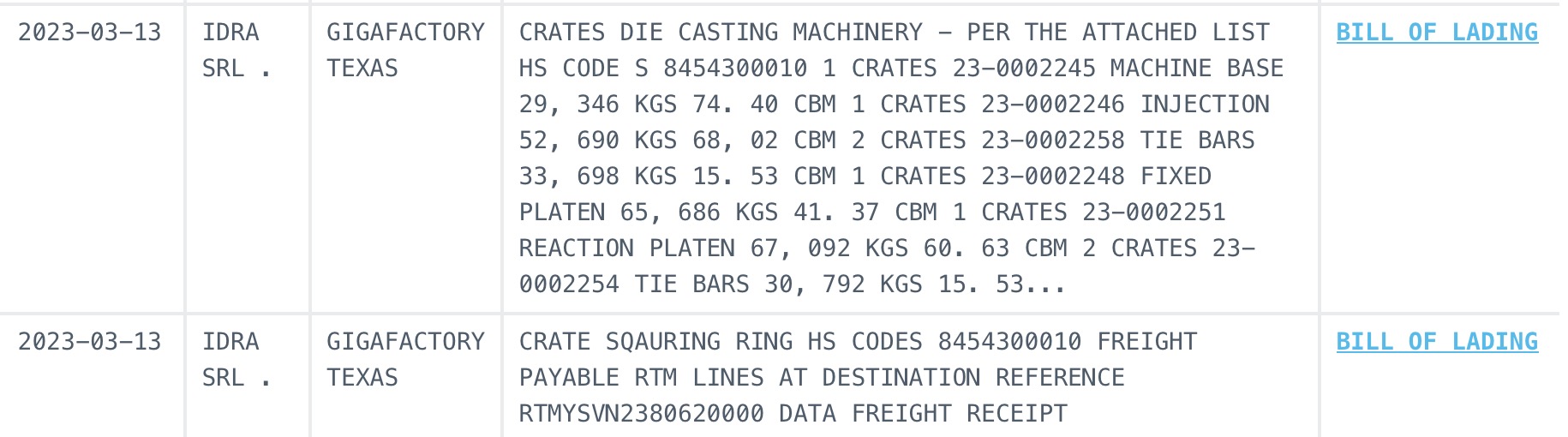 Additional shipping records show numerous crates from IDRA being shipped to Gigafactory Texas, again revealing they contain pieces of “die casting machinery.”
