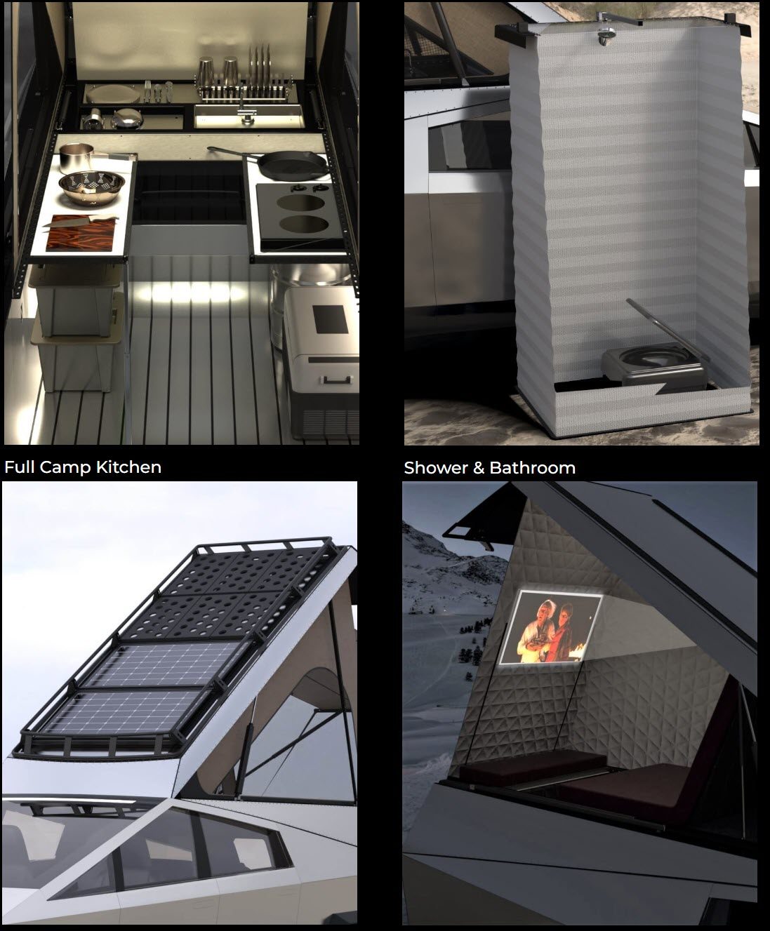 The company, based in San Luis Obispo, California says the camper is designed with a sleek appearance for minimal drag. Despite its compact form, the camper expands and becomes a “swiss army knife” for the Cybertruck. That expansion will be handled air-powered actuators that will use the Cybertruck’s onboard compressor, which we still don’t know for sure will be included on the Cybertruck.