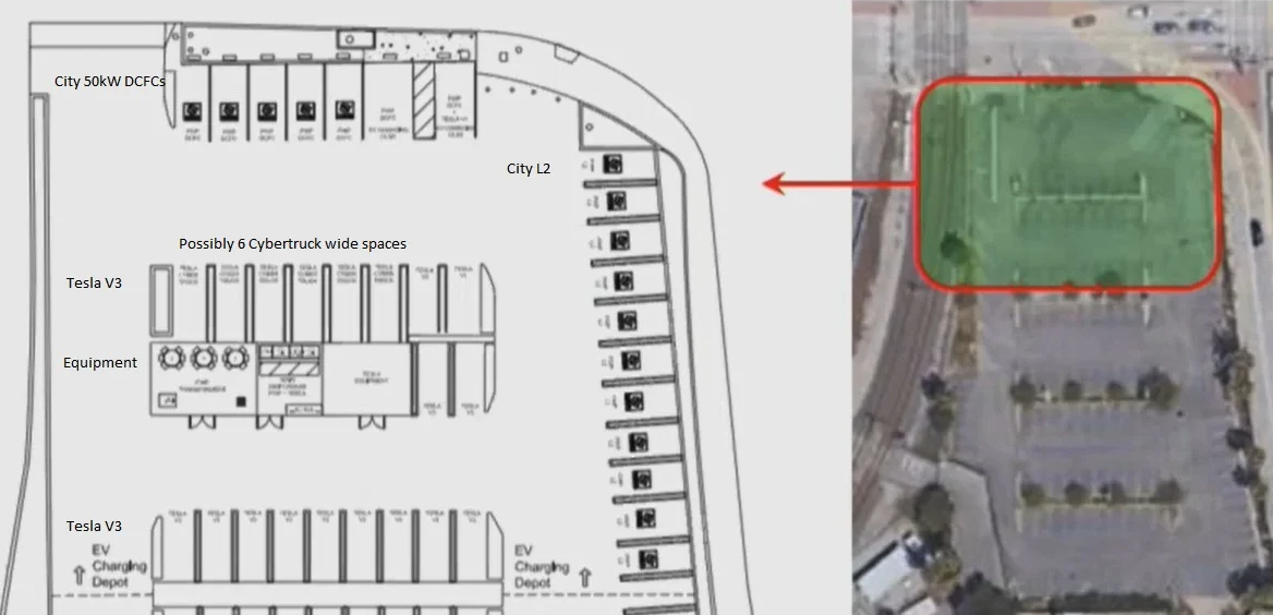 The site plans show the six Cybertruck stalls will be separated from the rest of the Supercharger stalls and located in the center of the lot. The plans also show that along with the 20 Supercharger stations, the city will also be adding 7 DC fast chargers and 20 Level 2 chargers.