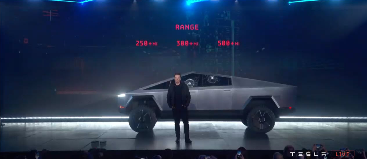 The body will be made of ultra-hard 30x cold-rolled stainless steel, the same alloy used for the Starship. During the event they demonstrated just how strong it is by taking a sledgehammer to it several times, without it leaving a dent or mark. They also showed video of it taking a 9mm bullet from a distance of 10 meters unscathed. Musk called it bulletproof to a 9mm bullet.