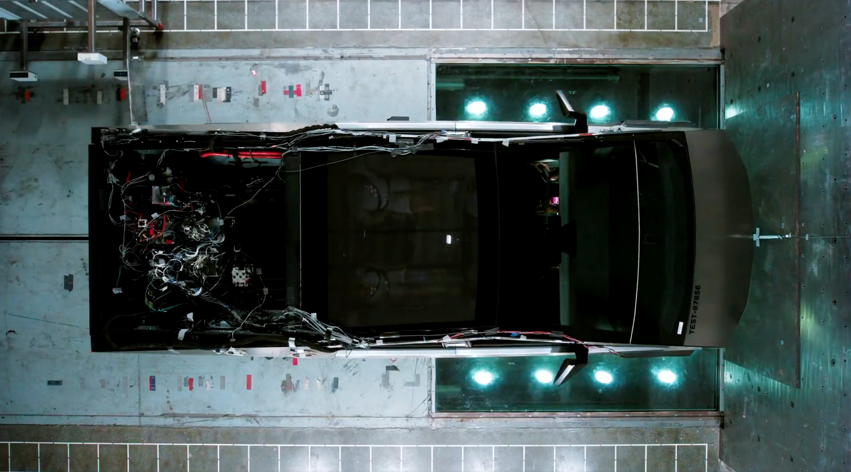 If this is a fake (the Cybertruck was just driving slowly towards the wall and the video was sped up), it is a very elaborate one. The Cybertruck is covered in wires and the Cybertruck’s Vault (aka bed) is filled with testing equipment. We also get to see some unique angles, like from directly above and underneath the Cybertruck.