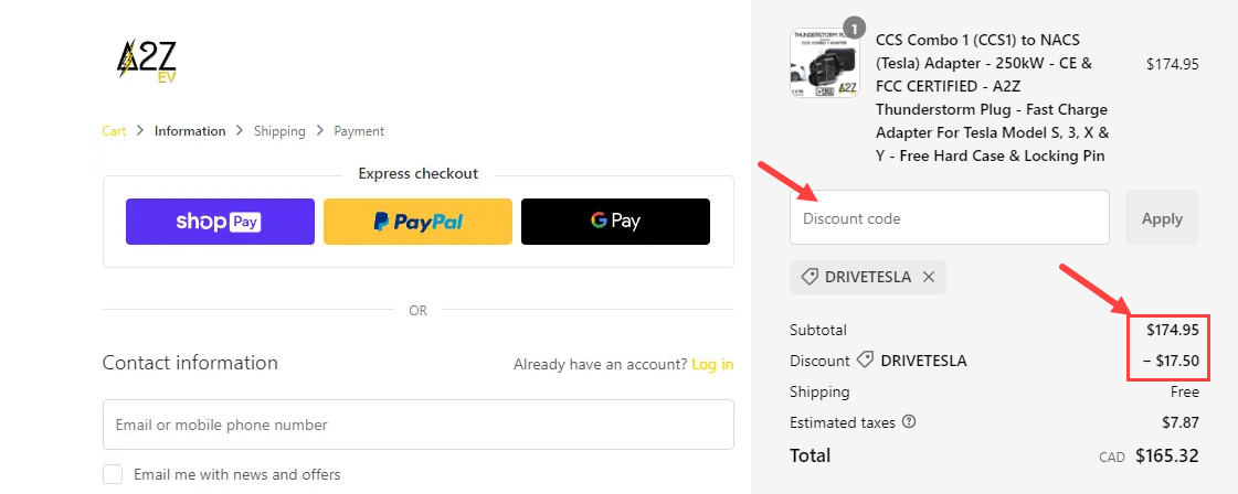 Simply use the coupon code DRIVETESLA at checkout at to bring the original price of $174.95 CAD down to $157.46, before taxes. This price includes free shipping anywhere in North America, and is more than $80 cheaper than the official Tesla adapter.