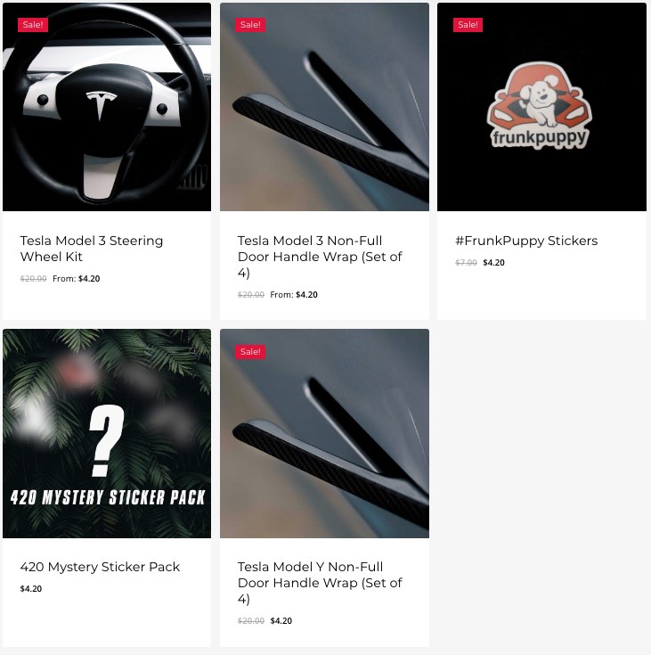 Included in the sale is their Tesla Model 3 Steering Wheel Kit, reduced from the regular $20 price down to just $4.20. Other items include the Model 3 and Model Y non-full door handle wraps and #FrunkPuppy stickers.