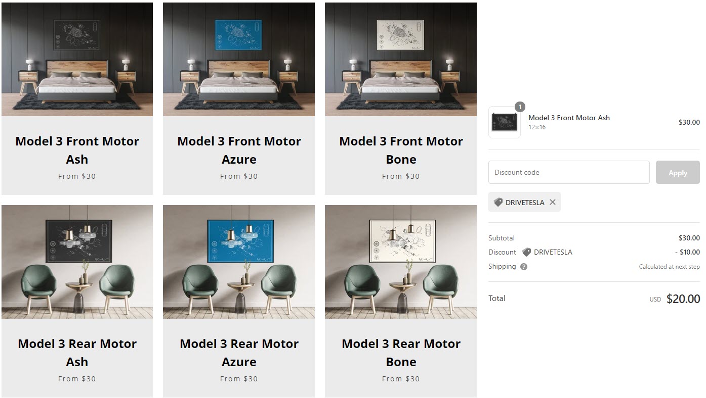 You can select between blueprints for either the front or rear motor, both of which are available in a variety of different colours and sizes. Prices start at just $30 USD for the smallest 12×16 blueprint, and up to $40 USD for the largest 24×36 size. But you can save $10 off any order by using the discount code DRIVETESLA at checkout.
