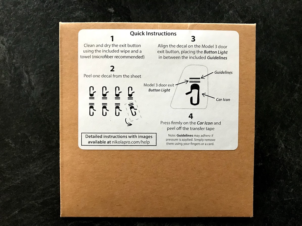 The Nikola Pro Tesla Model 3 Door Exit Decal Set arrives in a hard cardboard box to avoid the decals being damaged during shipping. Inside the package are 8 decals (two sets in case you make a mistake installing the first set) made from weather-rated, durable Oracal vinyl and backed by a 6-year guarantee. It also includes a wipe to clean the door exit button prior to installation.