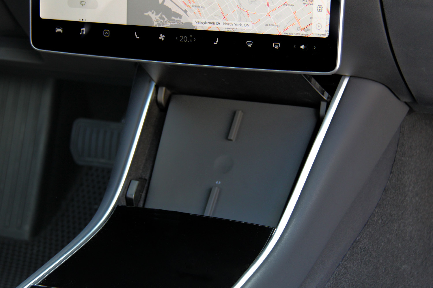 This wireless charger from Teslashop is made of premium TPE anti-slip material which helps keep your phone from sliding around, while matching well with the finishes of the Model 3 interior. It is compatible with any Qi enabled smartphone, like most newer Android phone and Apple’s iPhone 8 and above.