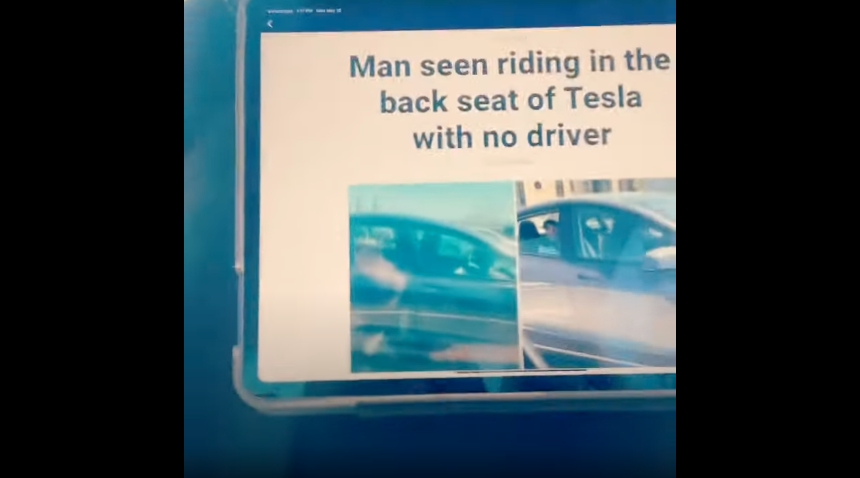 The threat of being arrested didn’t seem to phase the arrogant Model 3 owner. Yesterday he posted another video of himself in the backseat, showing headlines of his actions on an iPad. We aren’t going to share the actual video since it will get him views, but screenshots from the video are included below.