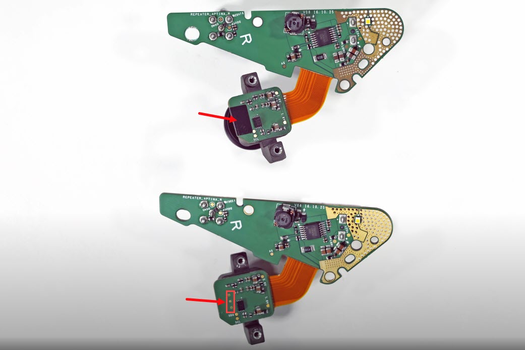 - Using a concealer, put a drop onto the PCB board and sensor to seal three small holes