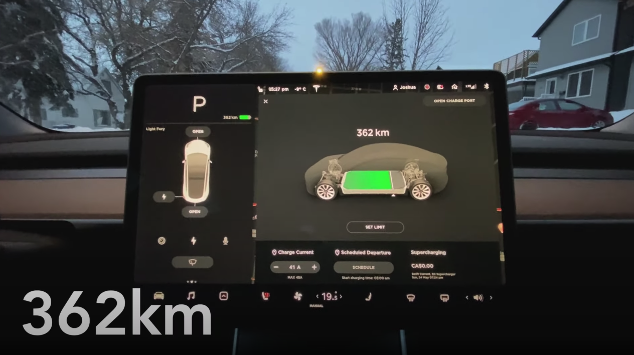 Beginning the test at 5:30pm with the temperature hovering around -9°C (16°F) and expected to reach as low as -18°C (0°F) overnight, Joshua starts the test with 362km of range showing on the in-car display.
