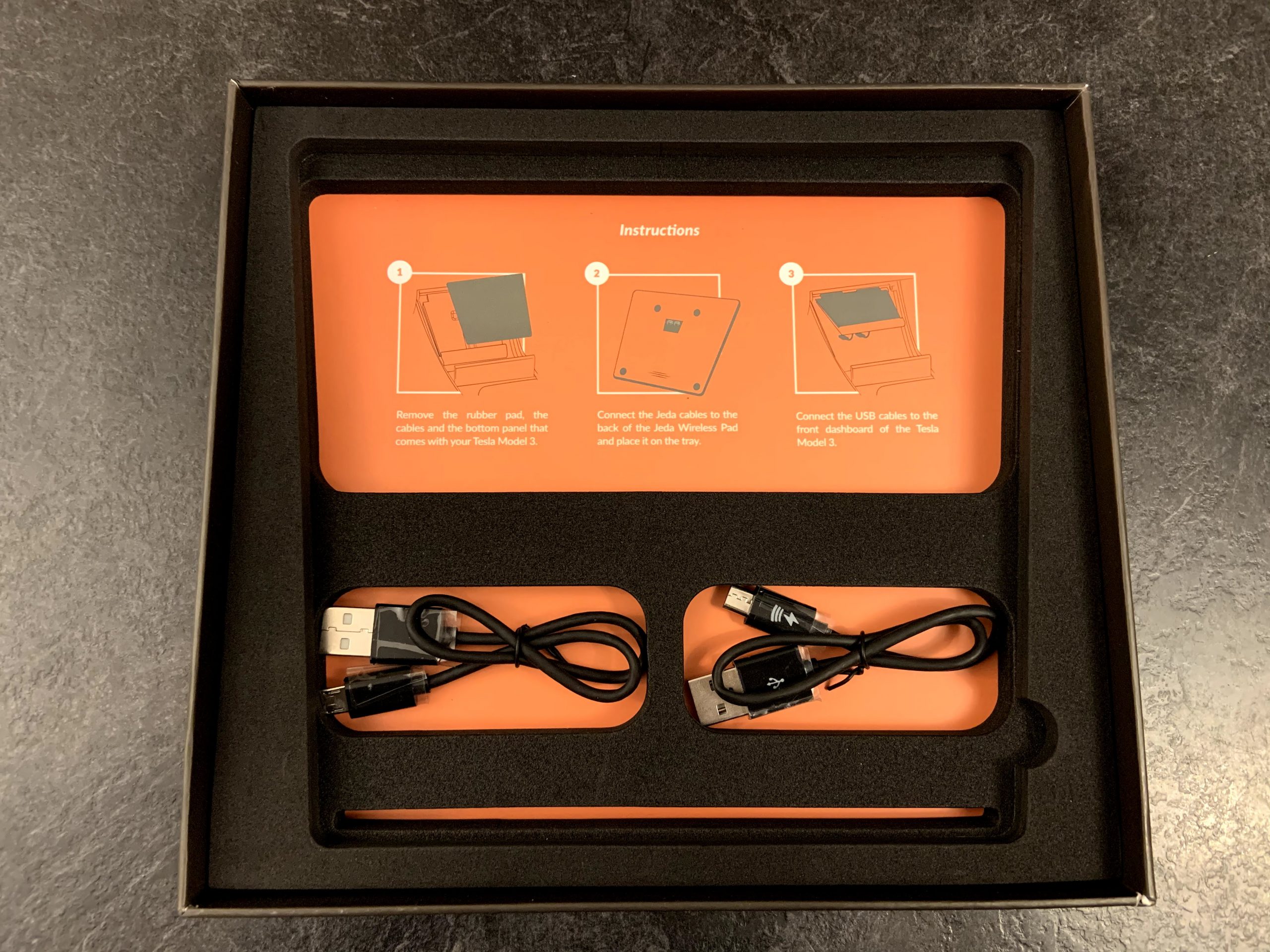 The Jeda Wireless Charging Pad comes in a very sleek box reminiscent of Apple packaging. Inside you will find the wireless pad, along with two USB cables to connect it to the USB ports in the center console.