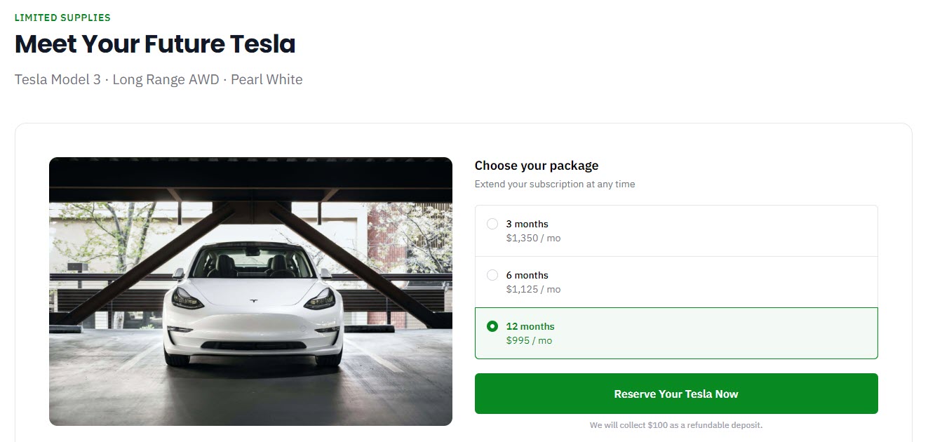 Kyte will going up another recent Tesla subscription service in California. Autonomy launched in January, and in terms of a financial commitment, operates slightly differently. Autonomy requires as much as a $5,500 down payment, which gives you a monthly rate of $550. Decrease your down payment to $1,000 and your monthly rate increases to $1,000.