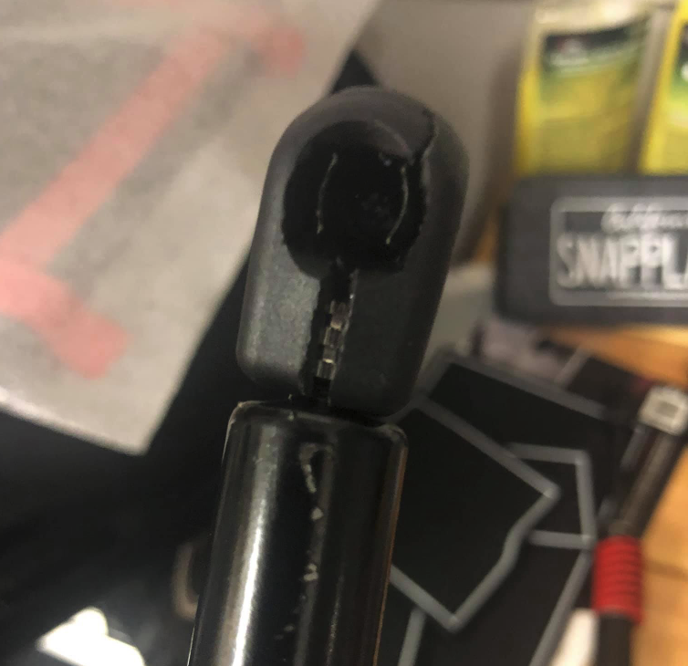 When trying to close his trunk, the strut simply fell off from the top attachment point, hitting his rear glass resulting in significant damage that will mean replacing his rear glass panel. Not only did it crack his glass, the struts also misaligned his trunk.
