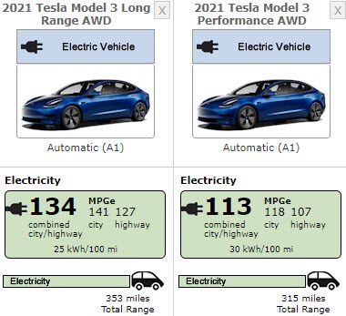 As you can see from the ratings, Tesla has been able to dramatically improve the efficiency of the LR Model 3 over the 2020 model year, now at a combined 134 MPGe. Even its highway rating at 127MPGe is higher than the previous city rating of 124 MPGe.
