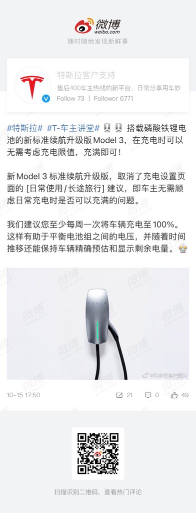“The new standard endurance upgraded Model 3 equipped with lithium iron phosphate battery can be charged without considering the charging limit, and it can be fully charged!