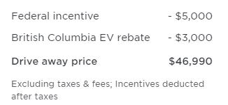 The most important aspect to this price change is its impact on provincial and federal rebates. According to the online configurator, it still qualifies for both in all provinces with additional incentives.