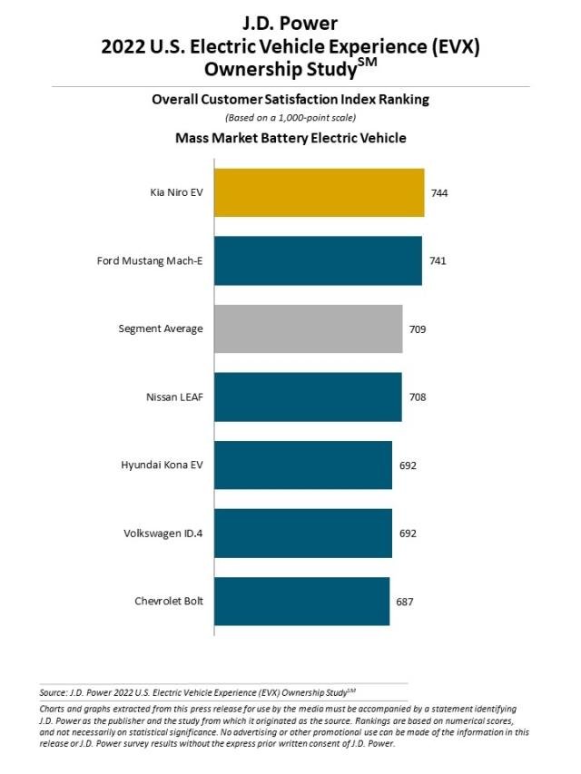Among owners of non-premium, or mass market brands as referred to by JD Power, the Kia Niro EV was the favourite with a score of 744 points, below the Model 3, Y, and S.