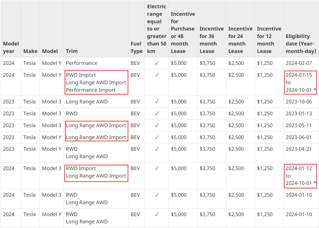 As expected, Transport Canada’s website now lists the import versions of the Model 3 and Model Y as no longer eligible for the federal rebate as of October 1, 2024. (Interestingly, the 2023 Model 3 and Model Y LR import versions are still eligible, but this is likely because Tesla no longer sells these.)