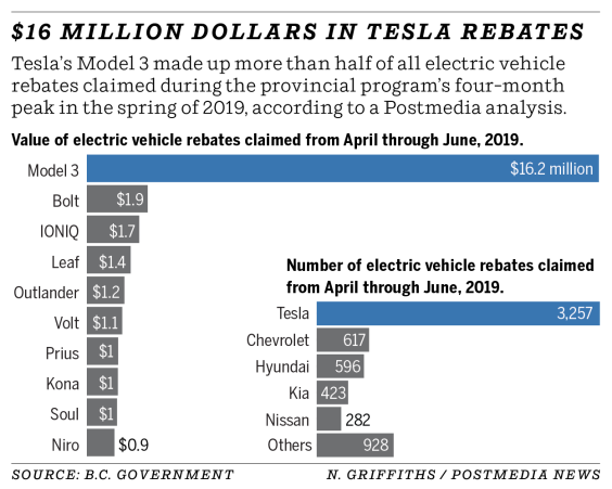 In terms of dollar value, new Tesla owners accounted for $16.2 million out of the $30 million funded to the program. That rush eventually led to the fund running out of money, before being given more money but with a reduction in the rebate from $5,000 down to $3,000 in late June 2019.