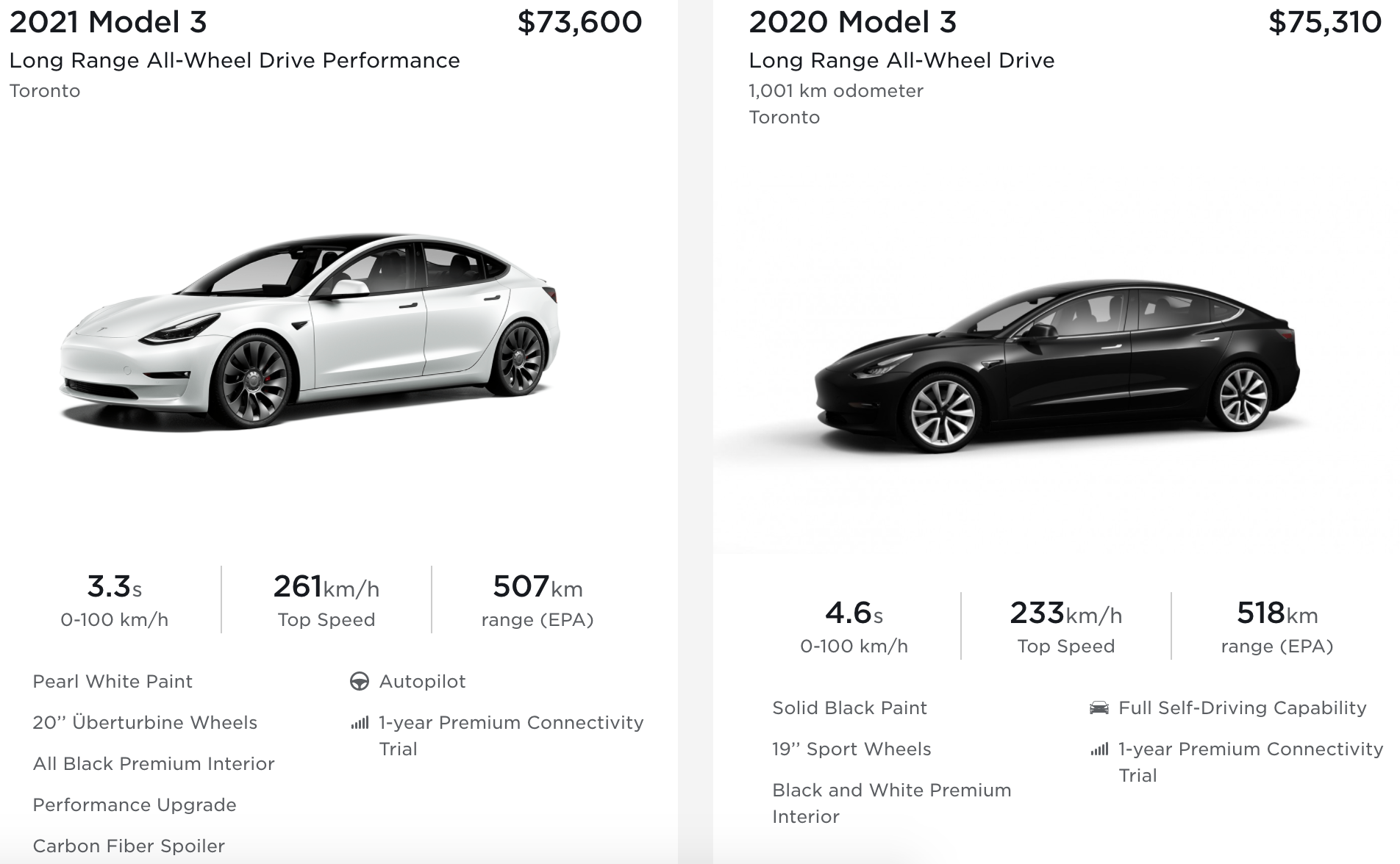 In Vancouver, there are just 3 units available, one SR+ and two LR variants. As of the time of publication there are no 2021 Model 3’s available in Calgary.