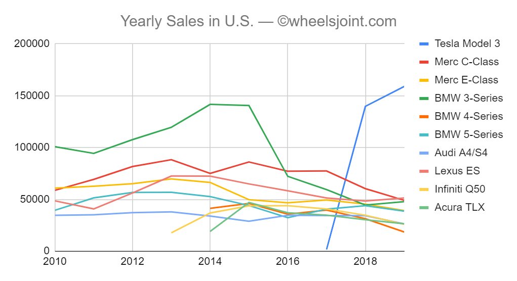 It is quite clear from the graph above to see the Falcon Heavy like rise of the Model 3 as production ramped up though 2017 into 2018. It is also quite clear to see the once-popular BMW 3-series going from a high of nearly 150,000 vehicles sold in 2014, down to less than 50,000 through 2018.