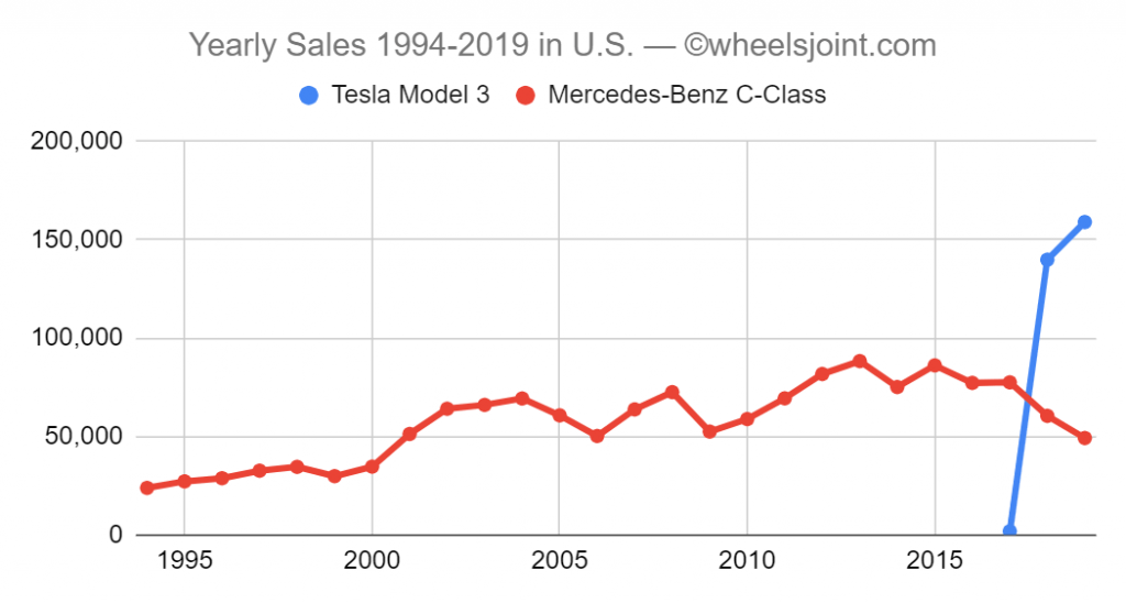 Another perennial favourite in the segment is (or was) the Mercedes Benz C-class. From its release in 1993, the Mercedes sedan has seen steady increases in sales almost every year, reaching highs of nearly 100,000 sales in both 2013 and 2015. Then came along the Model 3, and sales dipped from those highs by nearly half to less than 50,000 units in 2019, levels not seen for a decade.