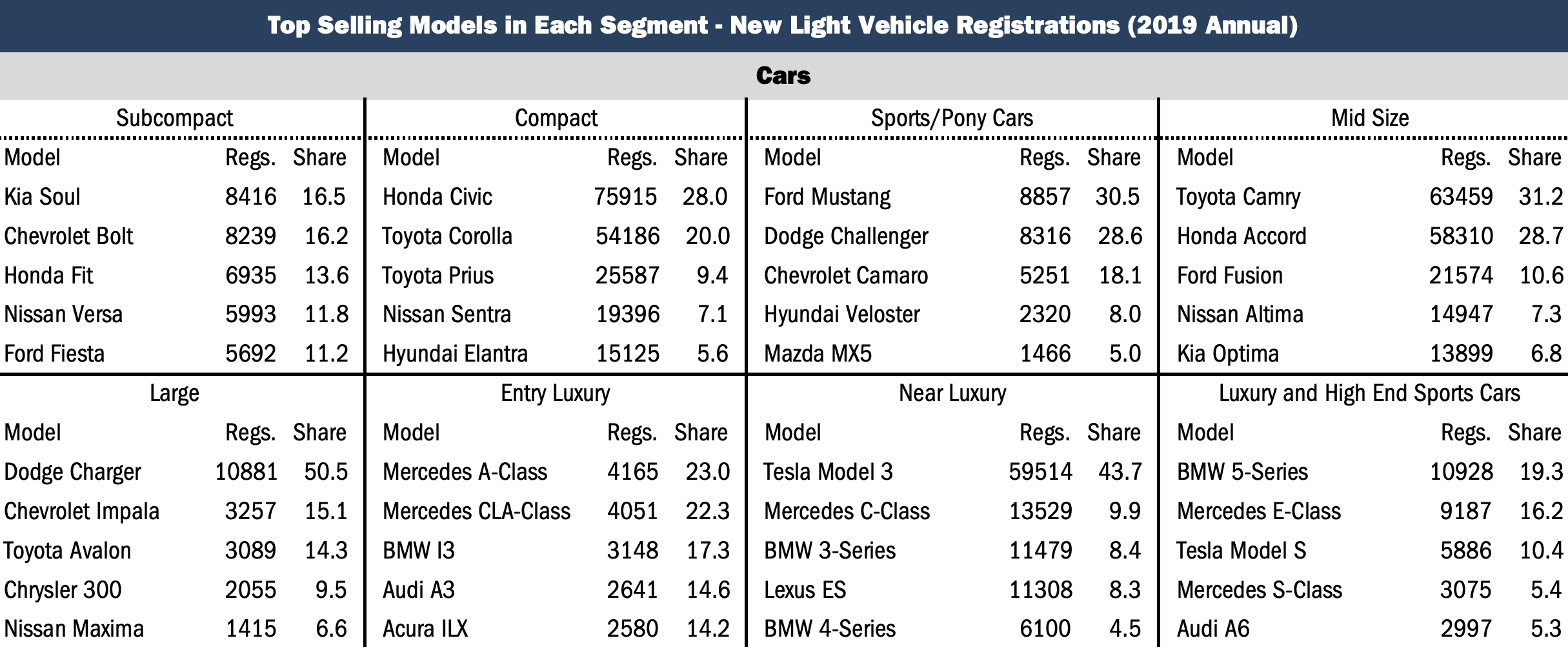 While the Corolla and Accord don’t compete in the same segment, they each had 54,186 and 58,310 registrations respectively, below the number of registrations for the Model 3.