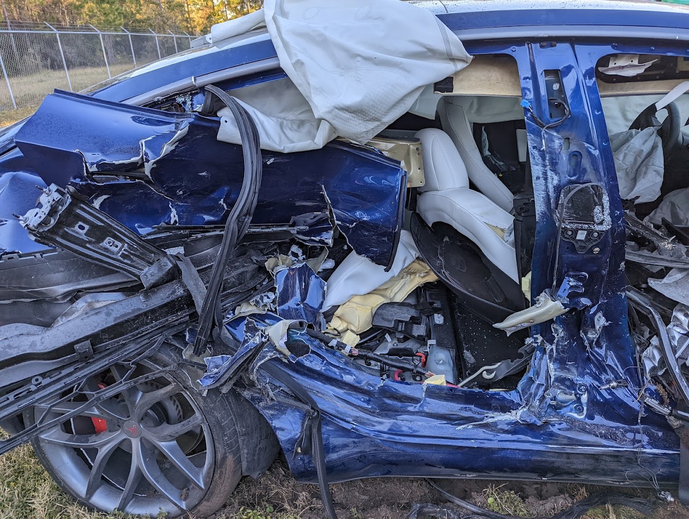 Photos shared with Drive Tesla taken after the accident show the extensive damage to the Model 3, damage so severe emergency responders had to use the Jaws of Life to cut the door off to remove the passenger from the vehicle.