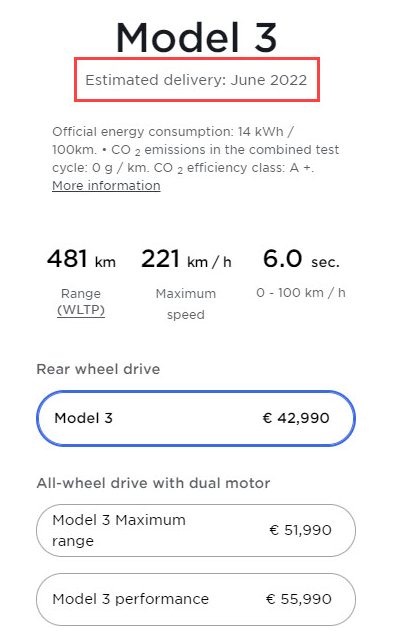If you decide to go with the stock choices (black interior, white paint, 18″ aeros), you will have to until June 2022 to receive your new car. (h/t: @tesla_adri)