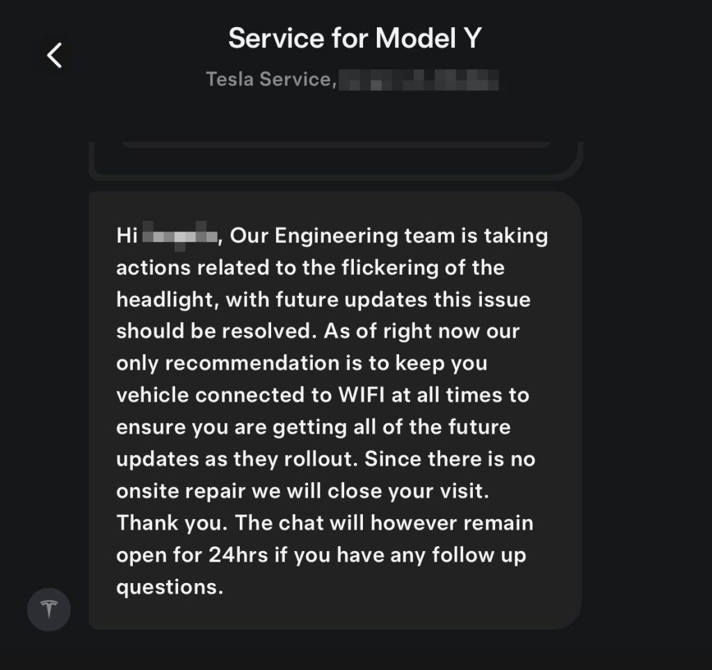 After scheduling a service appointment for this flickering issue, Tesla said in a message that their Engineering team has identified the issue and are “taking actions related to the flickering of the headlight,” and that with “future updates this issue should be resolved.”