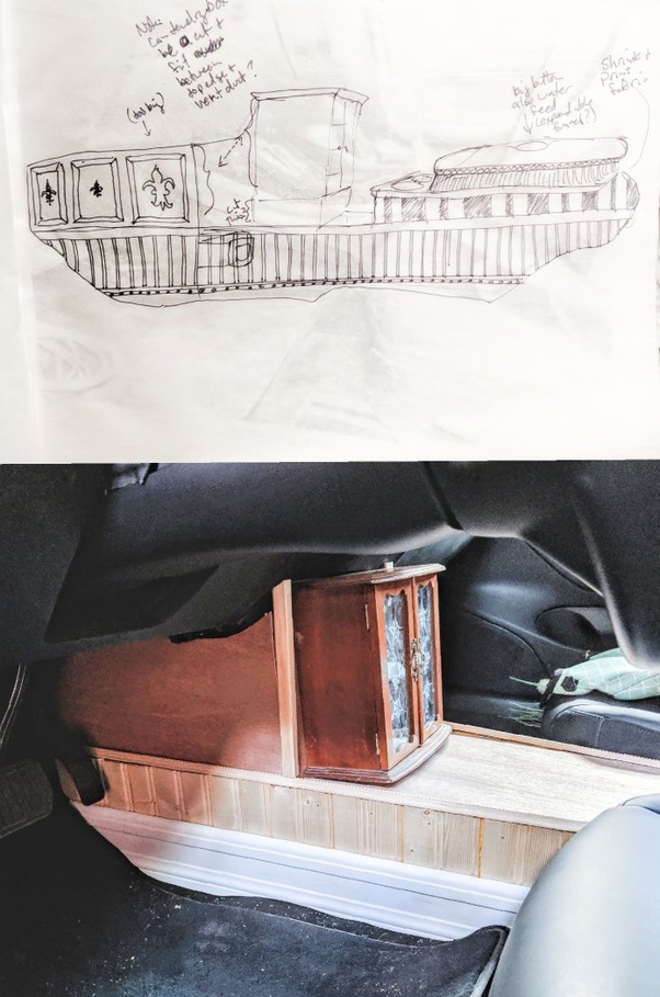 Probably the most unique and eye-catching change to the interior has been to the center console. Gone are the days of worrying about the piano black finish, as she has replaced the entire unit with an old jewelry box and converted it into a “tea engine” and scone baker.
