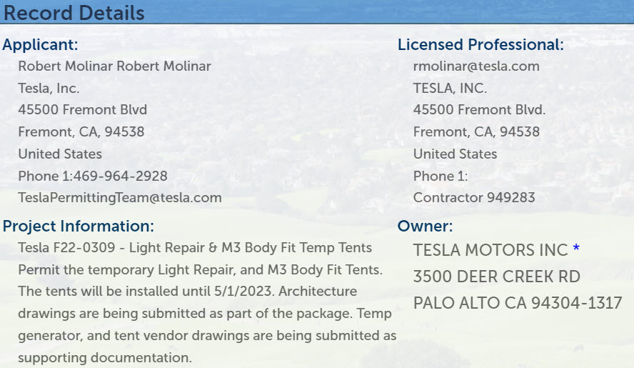 The application shows Tesla wants to erect temporary tents where the Model 3’s body fitting and light repair works will be done. The structure will be up till May 1st, 2023, and will cost $20,000.