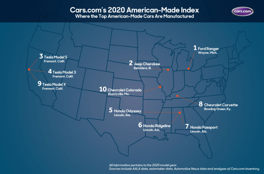 According to Cars.com, the rankings are based on a number of criteria, including assembly location, percentage of US and Canadian parts, sourcing of engines and transmissions, and manufacturing employees relative to sales.