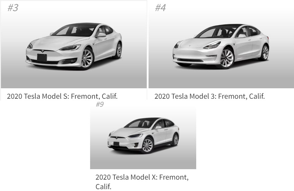 Tesla vehicles did not make the same list in 2019, but this year took 3 of the 10 spots with a new methodology, equaling Honda, which also had 3 cars in the top 10.