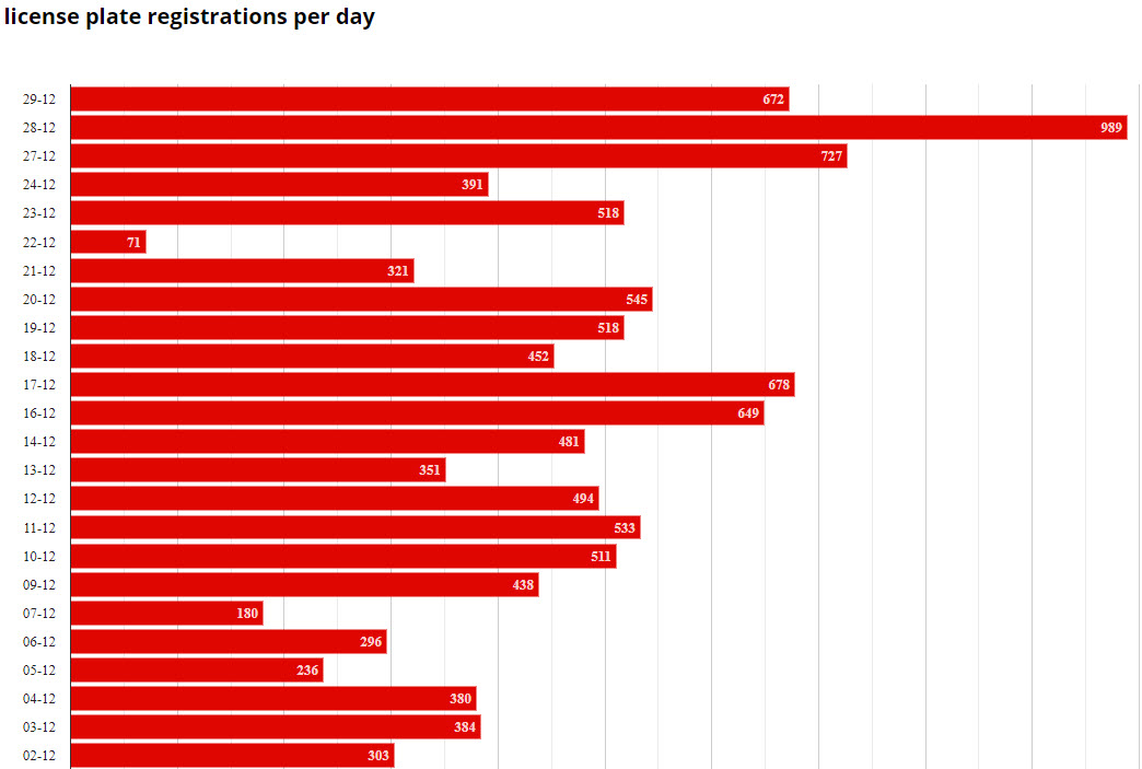 According to data from from Kentekenradar, the number of registrations for the Tesla Model 3 has reached 11,118 up to December 30, 2019. The number of registrations peaked on December 28, when 989 Model 3 vehicles alone were registered.