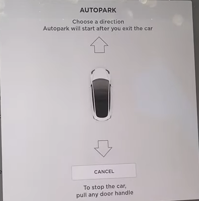 Then when you’re ready, double tap the right gear stalk. This will bring up the prompt on the screen where you select whether you want to AutoPark forward or backwards – select which one you want, get out of the car and close the doors, and your car will shift into gear and park itself.
