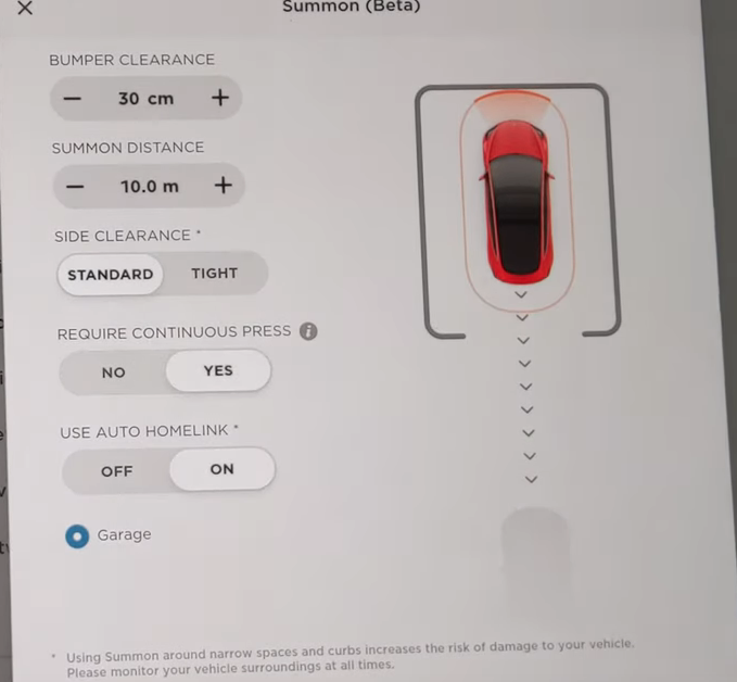 To access AutoPark, you have to go into the Autopilot menu settings, tap on Summon, and turn off “Require Continuous Press” (and then tap ‘Yes’).