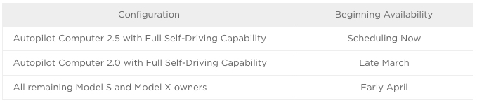 This MCU upgrade is not the same as the HW3 Full Self-Driving (FSD) Computer upgrade, which you will still need to pay separately for by purchasing the FSD package. Priority for the upgrade will be based on the configuration of your vehicle as per the table from Tesla below.
