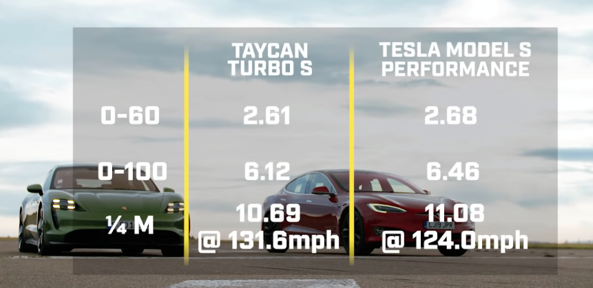 That’s not to mention the results showed the Taycan with a faster 0-60 time, yet the video shows the Model S ahead off the line and for at least the first 3-4 seconds, well past the time needed to reach 60mph.