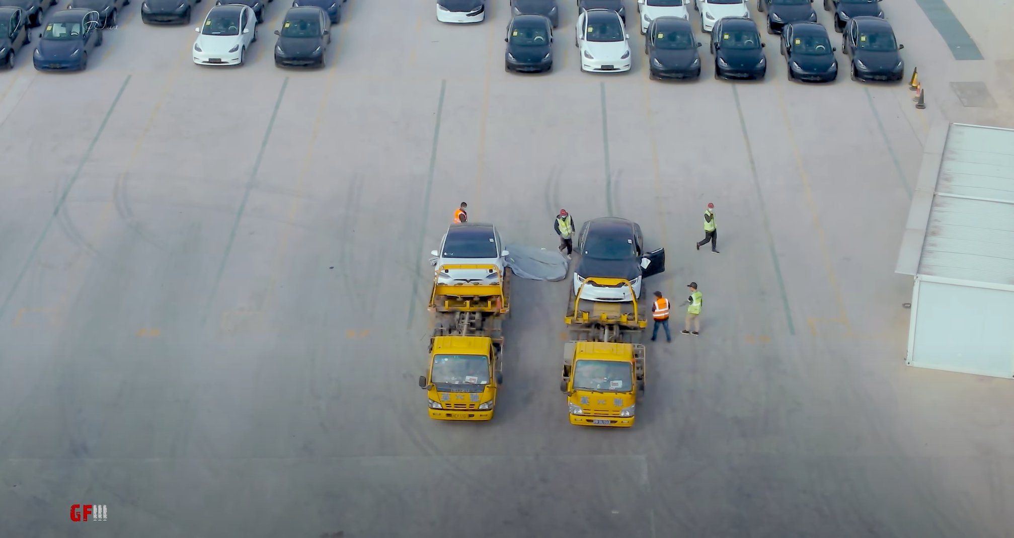 Several employees were trying to cover them up, but not before drone pilot Wu Wa was able to get his camera directly above the vehicles.