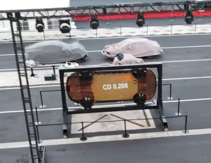 Near the center of the track there is also a test car held up sideways, showing off the undercarriage of the Model S. It is difficult to tell if Tesla is hinting at a structural battery pack here, but they are not hiding the fact it has the world’s lowest drag coefficient of any car of just 0.208. This figure has been known and posted to Tesla’s website for some time.