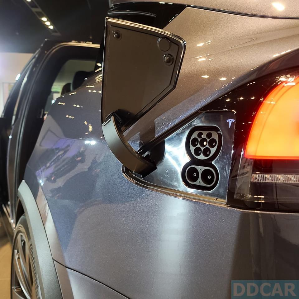 The charge port door is cleverly designed using the same parts from the Model 3 and Model Y, with the door inverted to match the lines of the Model S/X, as seen in this photo from DDCar.
