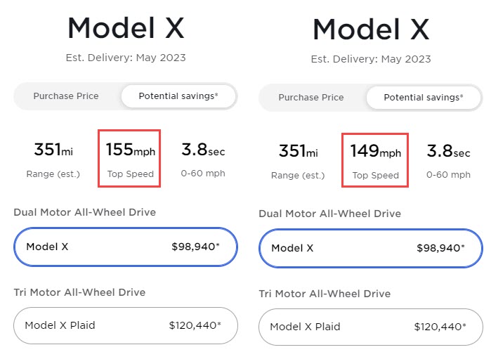 That is a fairly significant drop from before, when the Dual Motor Model X could reach 155mph (250km/h) and the Plaid could reach 163mph (262km/h). (h/t: @tesla_adri)
