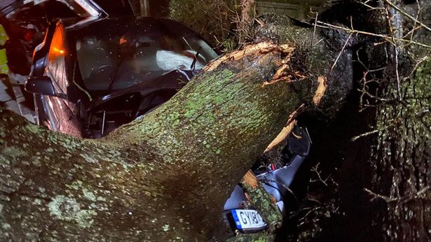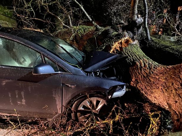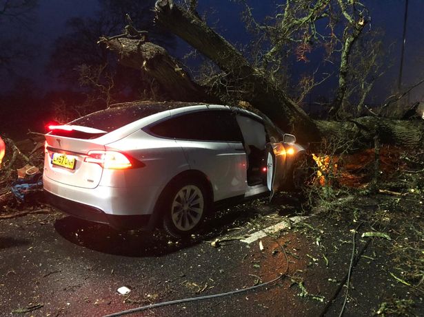 Two Model X SUV’s were driving towards each other along a quiet country road during Storm Dennis, which brought record rain and high winds to the UK. On the side of that road was a massive 400 year old Oak tree, that was about to come crashing down in front of both EV’s.