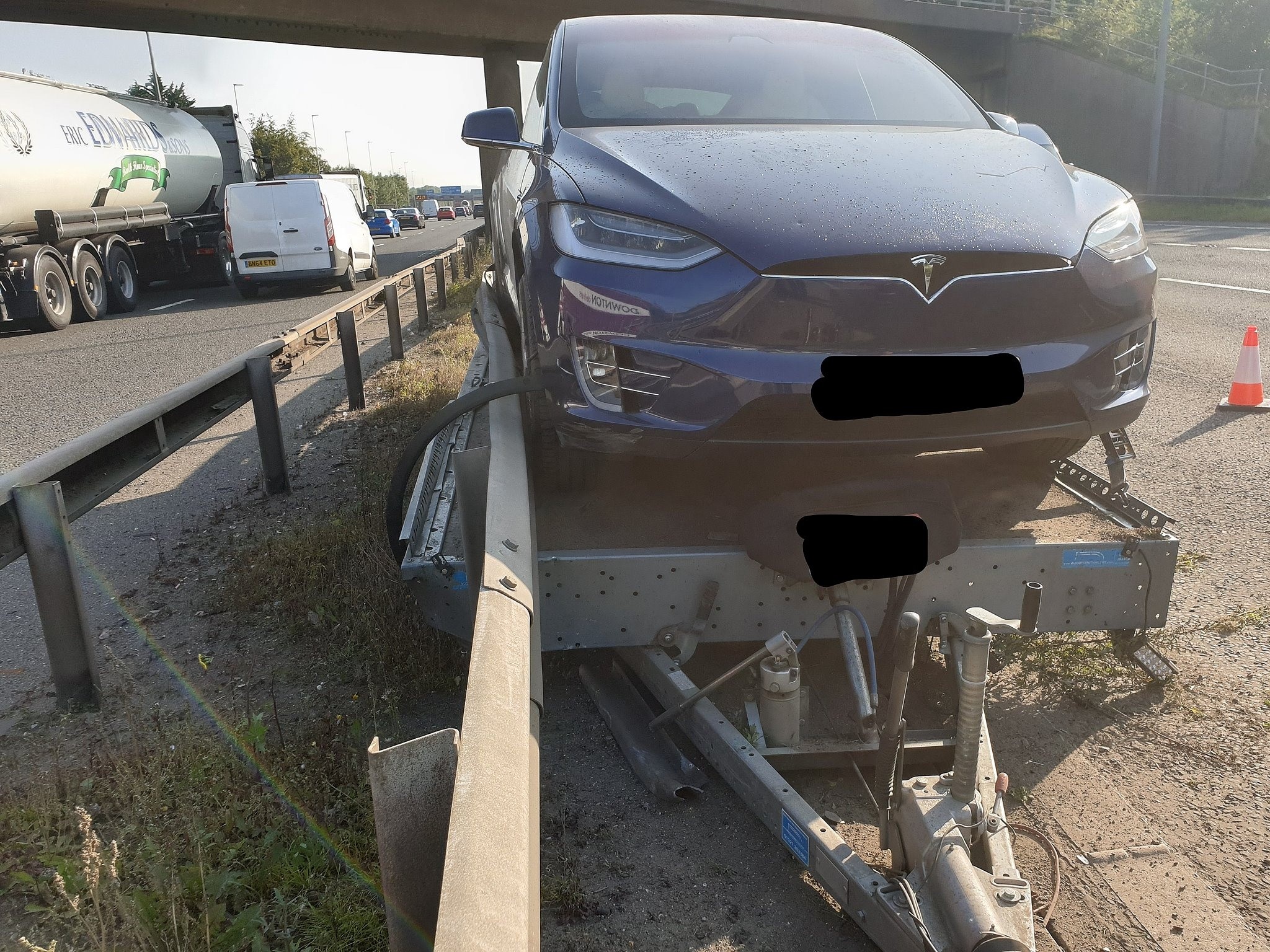 Unfortunately the brand new Tesla was damaged in the accident, which took several hours to clear as the barrier needed to be cut to remove the trailer, according to the NW Motorway Police.