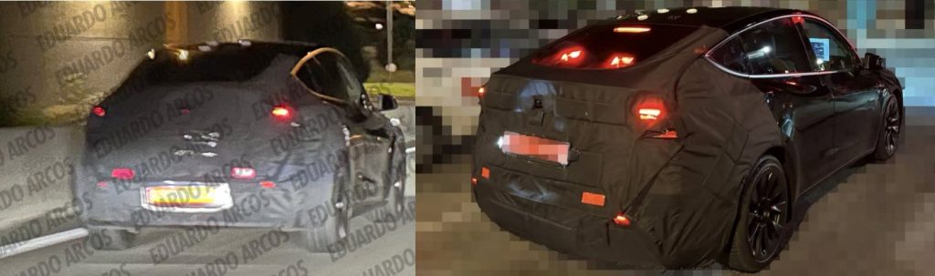 This second sighting gave us a much better look at the Model Y, and this one had an interesting design change from the last sighting in Spain earlier this month – the license plate is back on the tailgate (right), whereas the test vehicle in Spain (left) had the license plate on the rear bumper.