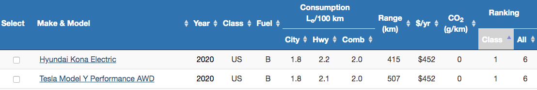 When using the tool to look at “Sport Utility Vehicle”, it is ranked first in its class in a tie with the Hyundai Kona Electric, which has almost identical consumption figures.