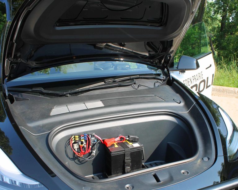 According to a report in the Eden Prairie Local News, the vehicle was delivered to the city back in December, when we originally reported on the planning documents for the purchase. Since the company that converts their cars has never worked on a Tesla before, it took about 7 months to fit the car with custom equipment tailored to the Model Y, including an extra 12v battery in the frunk.